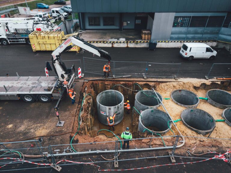 Wenn Starkregen zur Herausforderung wird, sind wir zur Stelle! Das Problem: Regelmäßige Überflutungen der Verladerampe und Parkplätze bei Starkregenereignissen – die alte Entwässerungsanlage war dem