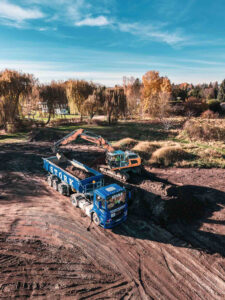 Ergänzend zur Regenrückhaltung erfolgt der Bau einer großen Sedimentationsanlage und der Neubau des Regenwasserkanals aus Stahlbetonrohr auf einer Länge von 200 Metern. Dafür bewegen wir über 3500 m³ Erdreich.