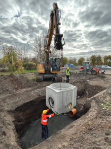 Ergänzend zur Regenrückhaltung erfolgt der Bau einer großen Sedimentationsanlage und der Neubau des Regenwasserkanals aus Stahlbetonrohr auf einer Länge von 200 Metern. Dafür bewegen wir über 3500 m³ Erdreich.